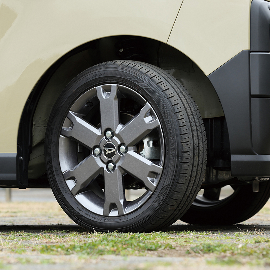 ●タント ファンクロスのグレード構成は、NAエンジンを搭載するファンクロスとターボエンジンを搭載するファンクロスターボの2タイプで、それぞれに2WDと4WDを設定する。最低地上高は2WDが150mm、4WDが165mmとなり、これはベースのタントと同じ。NAモデルは14インチアルミホイールを装備するが、ターボモデルは15インチアルミホイールが標準装備になる。取材車にはメーカーオプションとなるスマホ連携9インチディスプレイオーディオ(スマートパノラマパーキングパック付き)と運転席ロングスライドシート(540mm)が装備されていた