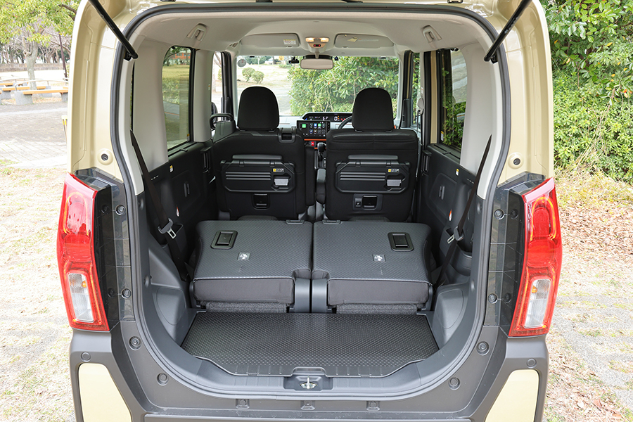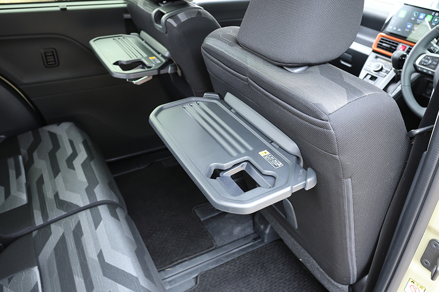 さらに荷室回りを強化した配慮が注目点です。裏側に脚が隠されているラゲッジボードが、ワンタッチでテーブルに早変わりするよう進化しました。もちろんアウトドアテーブルとしても使えますが、耐荷重20㎏なので、脚立替わりにはしないほうが賢明。これまでどおり、脚を出したまま荷室にセットすると、荷室を上下2分割する棚となり、さらに後部座席の背もたれを倒したときに、同じ高さのフラットな広い空間が作り出せます。そしてどちらもドット柄で、お掃除が簡単なワイパブル仕様となっているのも美点です。