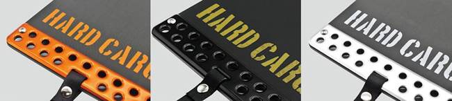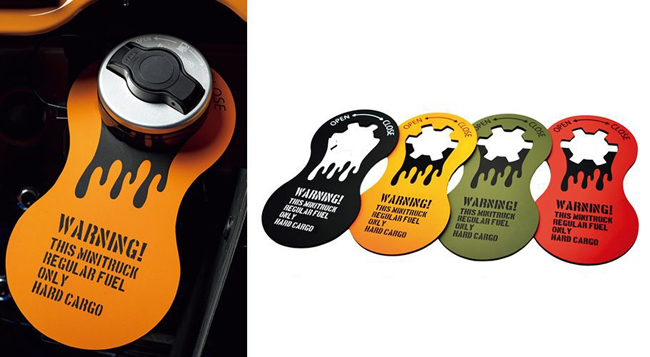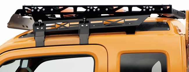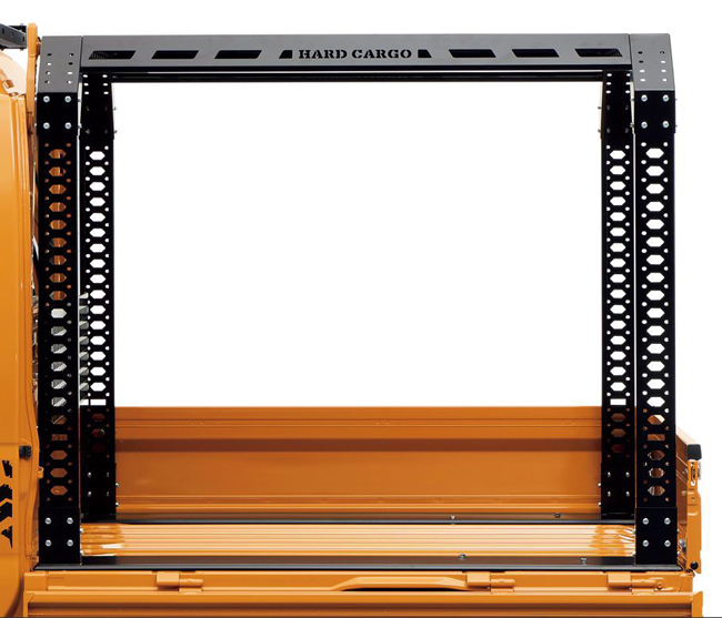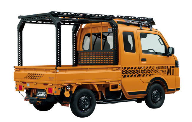 スーパーキャリイ向けのHARD CARGO製品は、ベースキャリア(15万4000円)、ルーフラック(8万8000円)、キャリアラック(7万7000円)、キャリアユーティリティパネル(2万9040円)、ベースキャリア専用追加バー(2本セット、9900円)、ランニングパイプ(6万9300円)で基本を構成。ほかに、より外観を引き立てる角パイプ用パッド(オレンジ/ブラック/カモフラージュ、2200円)やマッドフラップ(ブラック×オレンジアルマイト×オレンジロゴ/ブラック×シルバーアルマイト×グレーロゴ/ブラック×ブラックアルマイト×カーキロゴ、1万780円)、フューエルキャップ(ブラック/シルバー、2420円)、フューエルフラップ(ブラック/オレンジ/カーキ/レッド、1980円)、カラープロテクター(モノクローム/カモフラージュ/トリコロール、4950円)、ルーフネット(オレンジ/カモフラージュ、1万9580円)をラインアップする。