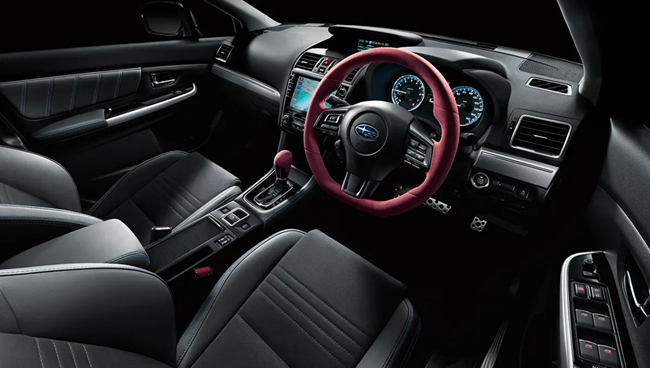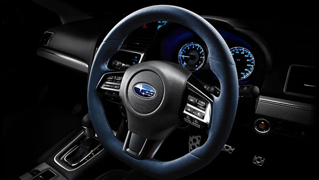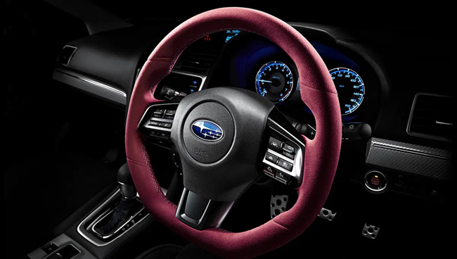 ▲先代レヴォーグ(VM型)およびWRX S4(VA型)などを対象とした「SUBARU Ultrasuede Package」は滑らかでしっとりとした手触りと、優れたグリップ力が特長のスエード調人工皮革ウルトラスエードを用いたステアリングとシフトノブを装着