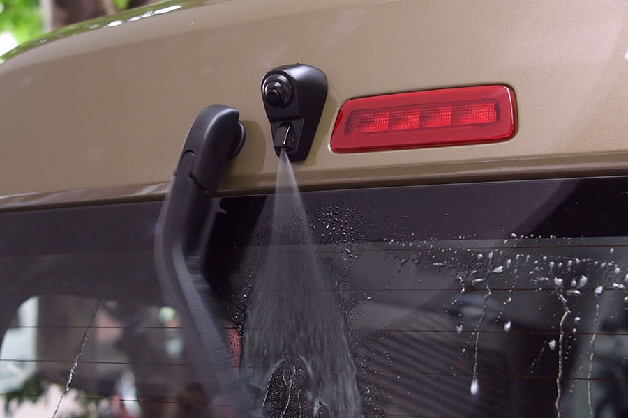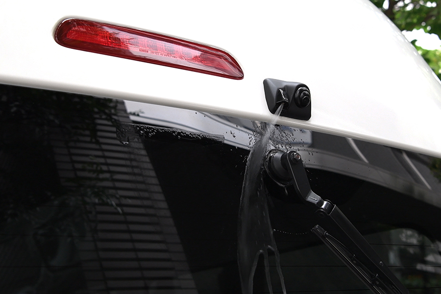 ハイマウントリアカメラキットは、ルーフ付近に設置されたウオッシャーノズル取り付け部を利用して、後方の視界を確保するアイテム。ジムニーの場合は背面タイヤよりも高いポジションからの映像になるため、タイヤが壁にヒットする心配が解消できる。