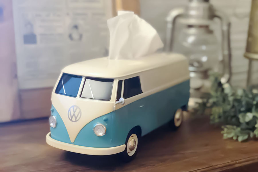 CAMSHOPはVWタイプIIバスをかたどったティッシュケースを発売 した。商品名はVW・T1バス・ティッシュケース+(プラス)ツートーン・ カップホルダー付き。実車の16分の1スケールで、本体は全長×全幅× 全高266×118×119mm。ステーショナリーを整理などに も活用できるようカップホル ダーが付属している。ボディ カラーはツートーングレーや ツートーン・リミテッドベージ ュなど8タイプ。4400円。