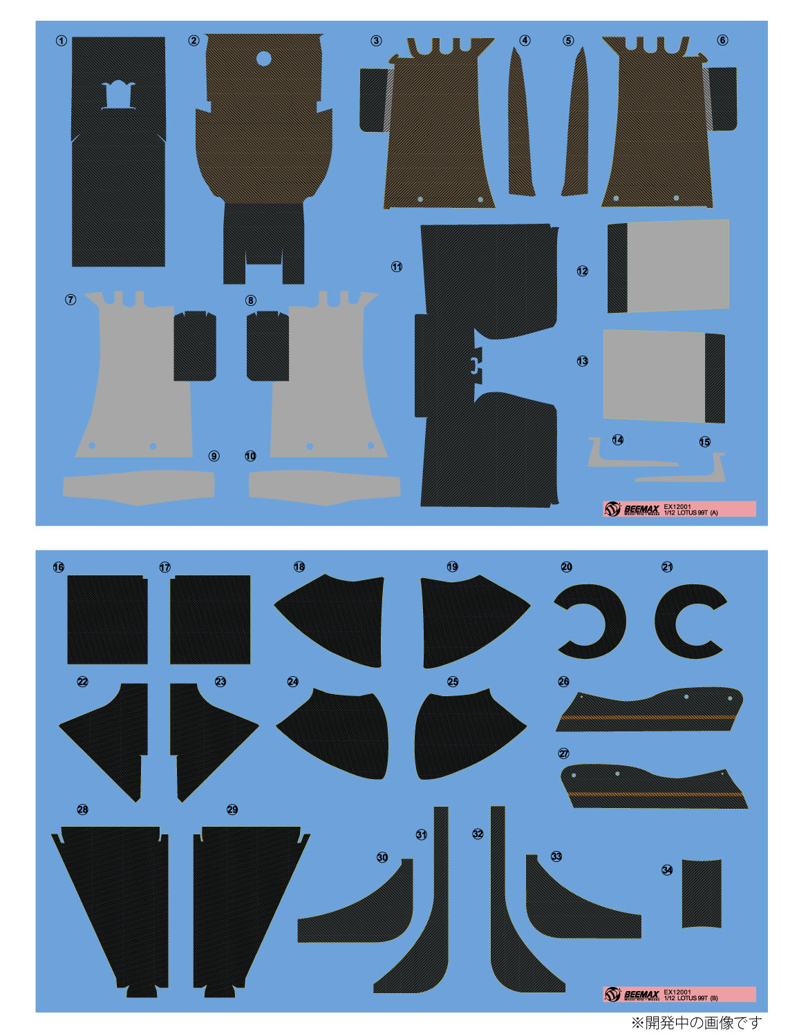 サスペンションアームは特殊な樹脂製で、形状と構成を細部までこだわって仕上げている。キットの価格は2万8600円(税込み)。このキットとともに注目したい商品が、専用のディテールアップパーツである。1万340円の別売になるが、カーボンディテールを表現したり、シートベル金具やラジエターのメッシュなど、細部の完成度をいっそう高めるキットだ。