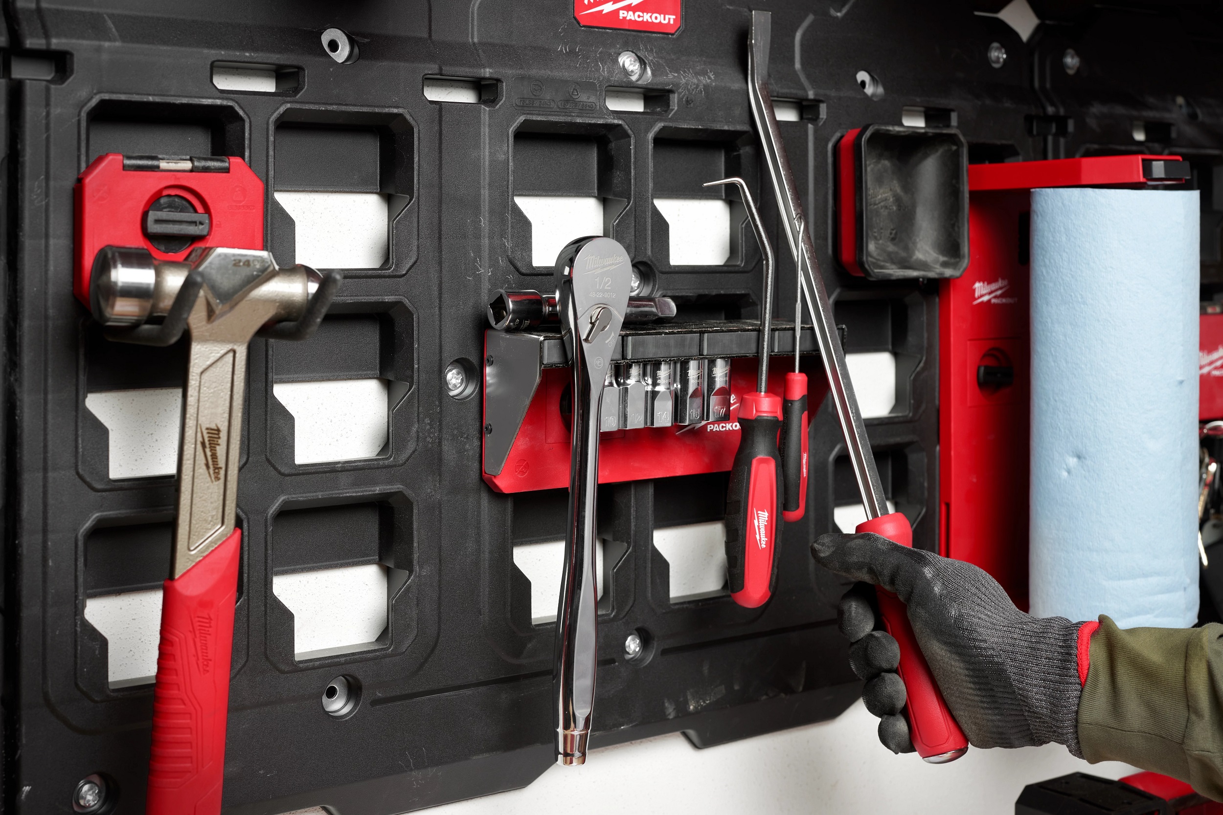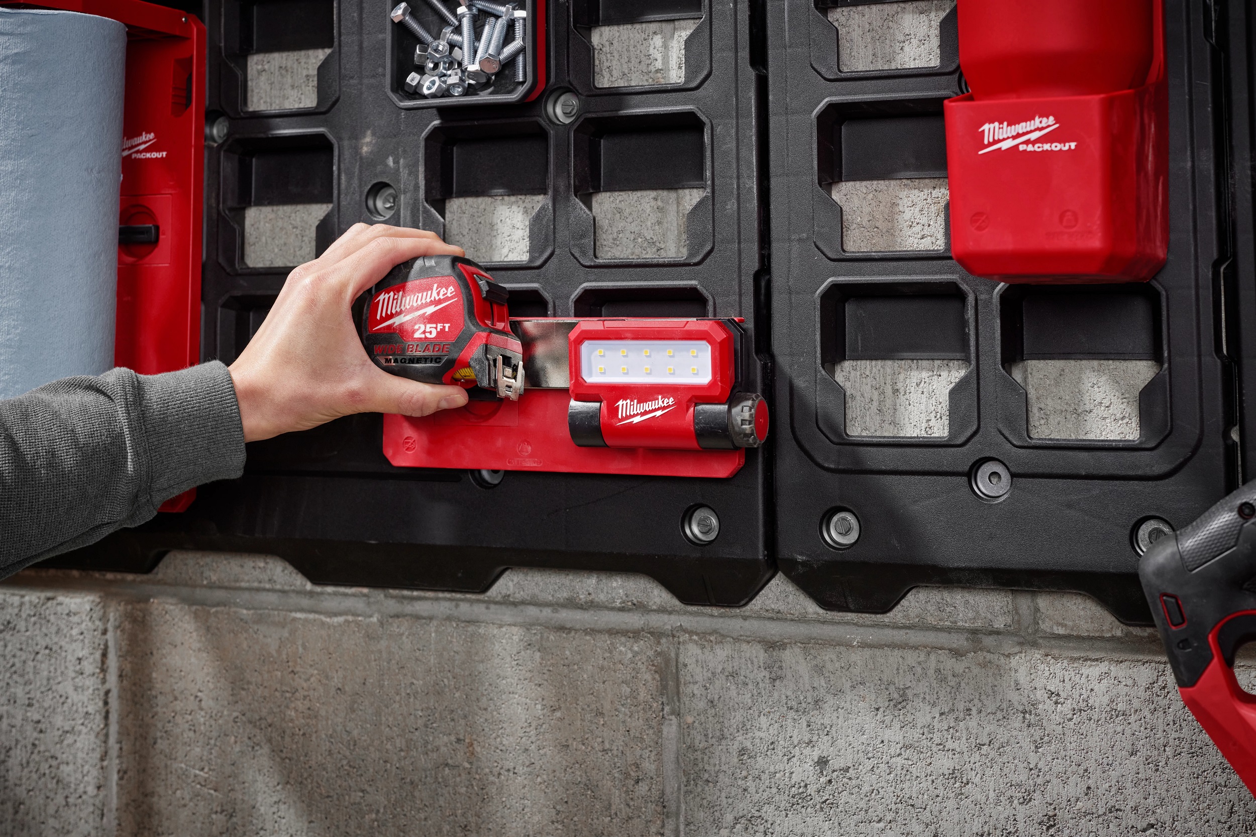 ミルウォーキーツール・ジャパンはツールボックス、PACKOUT™️シリーズにアクセサリー全8種類を加え、7月に新発売した。このアクセサリーは、PACKOUT™️シリーズ製品を連結するマウンティングプレートと組み合わせて使用し、マグネットで固定するタイプとツイストロックタイプを設定する。左の写真中央の連続フック(3058円)はドライバーやスパナなどを管理するのに便利。DIYの作業効率を高めてくれるアクセサリー類である。