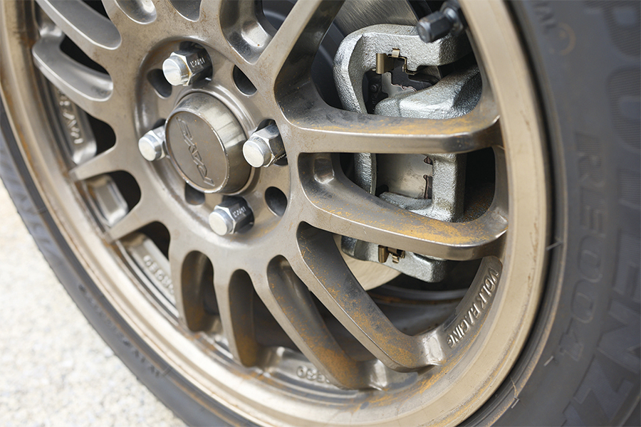 舗装された一般道を走るよりも、サーキットを一度走行した後の方が、クルマは格段に汚れる印象を受ける。特にブレーキダストの量は、一般道とは比べ物にならないほどで、ホイールは鉄粉によって茶色くくすみ、本来の色がほとんど隠れてしまう。また、ボディ下部にはタイヤカスや細かい砂が付着し、全体にうっすらと黒ずんだ汚れが広がる。フロントやフェンダー周りでは、触るとザラザラした感触が残るほどだ。