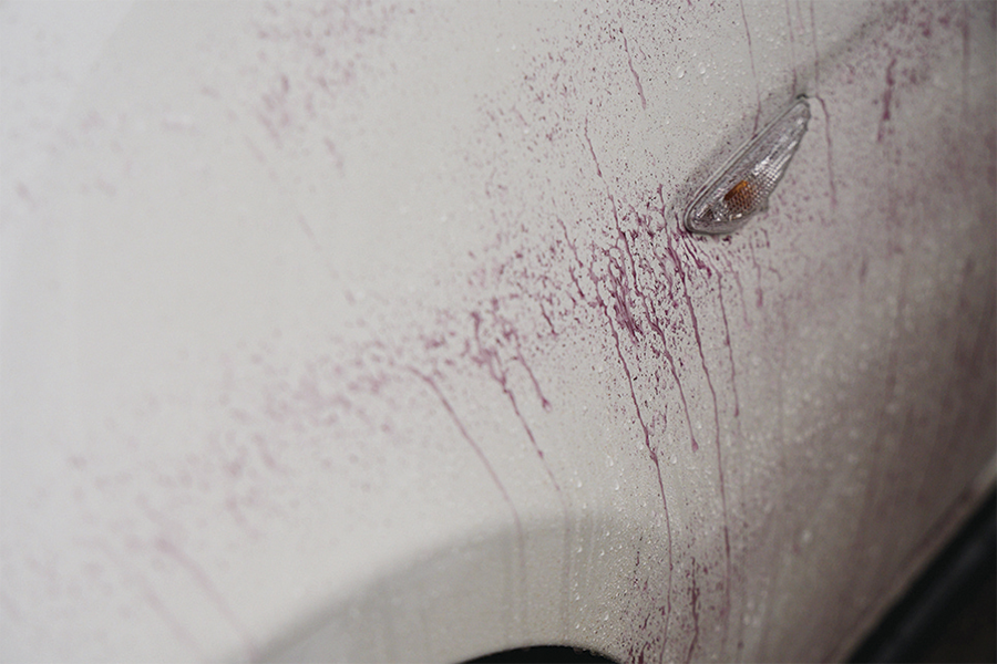 また、スプレータイプなので広範囲に噴射でき、ジェル状の液剤はサイドボディのような垂直な箇所でもしっかりと密着し、効果を発揮する。今回はホワイトのボディだったため、鉄粉が紫に変色するのがとても分かりやすかった。