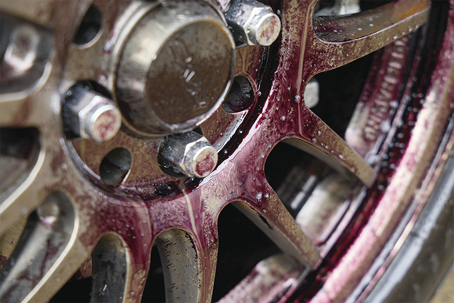 こうしたサーキット走行後の洗車で重点的に行うべきは、やはり鉄粉除去だ。今回は、ボディとホイールの両方に使える鉄粉除去剤と、しつこい鉄粉を取り除くためのねんどクリーナーを使用した。使用した鉄粉除去剤は「モンスターベリーベリーラッシュ」という商品で、鉄粉に反応して紫色に変色するため、鉄粉の存在が視覚的に確認でき、作業効率を大いに高めてくれる。