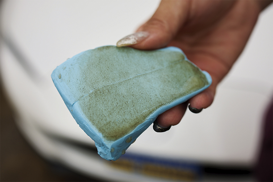 ボディ全体を優しく洗い終わったら、再度高圧水で泡を残さず洗い流す。もし鉄粉が残っている場合は、ねんどクリーナーを使って除去するのが効果的だ。鉄粉の残りを確認するのにおすすめなのが、お菓子の外箱を包む透明なパッケージだ。この透明袋に指を入れてボディを軽く撫でると、鉄粉がついている部分は触り心地が明らかに異なるため、その箇所をねんどクリーナーで擦ることで、より完璧な仕上がりに近づけることができるのだ。