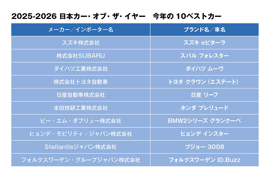 2025年10月30日(木)、一般社団法人日本カー・オブ・ザ・イヤー実行委員会 は、日本カー・オブ・ザ・イヤー 2025-2026の最終選考会に進出する上位10台の「10ベストカー」を「Japan Mobility Show2025」の会場で発表した。